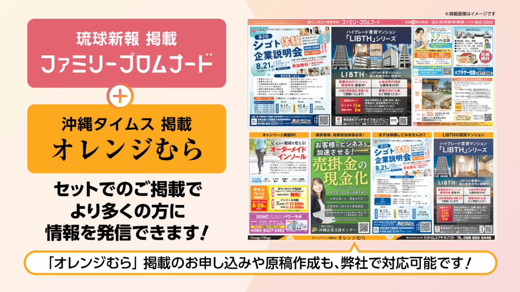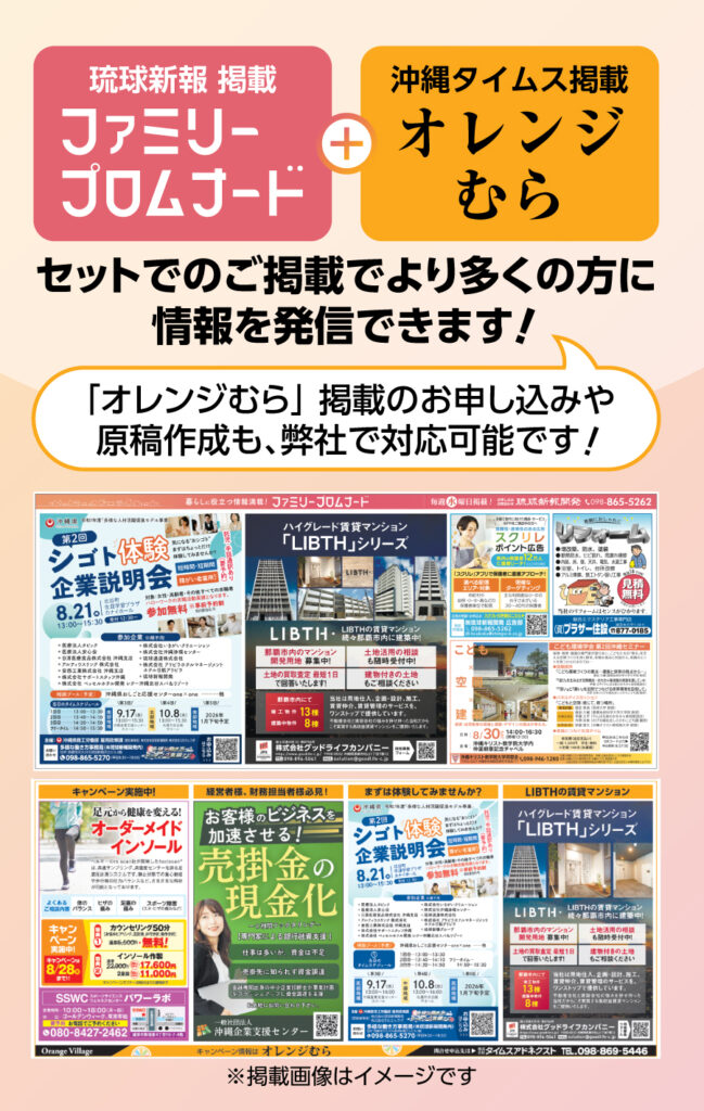 沖縄タイムスの広告枠「オレンジむら」とセットでご利用いただくケースも多くございます。両紙に掲載することで、より多くの皆さまへ情報をお届けすることができます。「オレンジむら」への掲載も、弊社にてお手続きが可能です。ぜひ、ファミリープロムナードとのセット掲載をご活用ください。